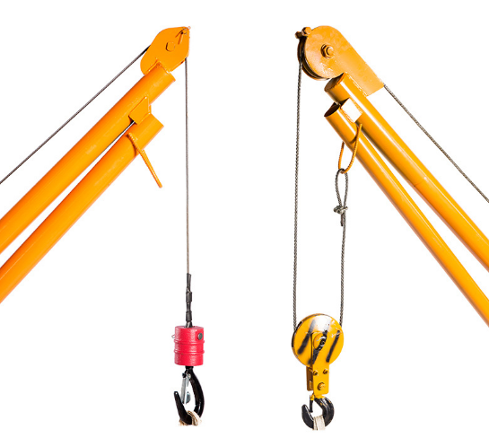 吊臂的頂端大多為定滑輪設計,這也是傳動鋼絲繩的重要裝置,利用定滑輪可以改變力的方向從而達到提高效率的目的。除了頂端的定滑輪,吊臂的下方,也就是處于下層的臂管有一個固定的吊環,這個吊環則目的是為小吊機增加了一種吊運方式,用它來連接鋼絲繩末端,此時的滑輪吊鉤形成了一個動滑輪,整體就構成了一個滑輪組,改變力的方向的同時又可以節省力氣,這就是它的設計意義。