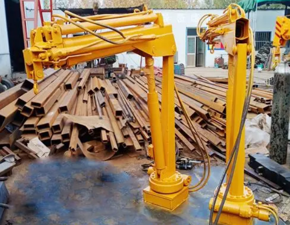 而折臂式小吊機就不同了,因為在原有臂桿末端再度加裝了可進行360度旋轉的臂桿,二段臂桿的角度變換配合一段臂桿的旋轉,基本上可以覆蓋到整個圓形范圍,并且這個圓形范圍在原有的基礎上翻倍了,而且是站樁作業,無需移動,靈活且便捷。